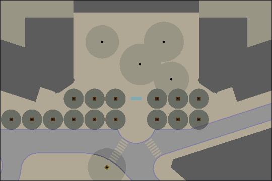 A l'ordonnance classique des logements correspond un dessin symétrique de la place. Les emplacements de parcage ont pu être trouvés ailleurs. La sculpture occupe une position centrale, vers l'avant, de manière à marquer symboliquement une limite entre la rue et la circulation et l'espace protégé des habitants, avec bancs et jeux pour enfants. La limite est encore accentuée par une double rangée d'arbres fruitiers, qui définit une promenade piétonnière. Devant la sculpture le tracé circulaire de la place piétonnière noue solidement les axes spatiaux et les mouvements concrets.