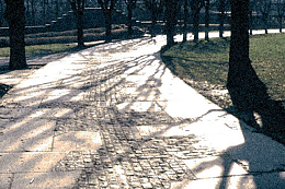 Très présent en arrière-plan, un mur de maçonnerie de briques sombres, dans une composition au classicisme simplifié. L'orientation fait qu'il est rare que le soleil donne vie à ce décor. De l'ensemble se dégage une impression de désolation qui n'est peut-être pas à rejeter d'emblée.